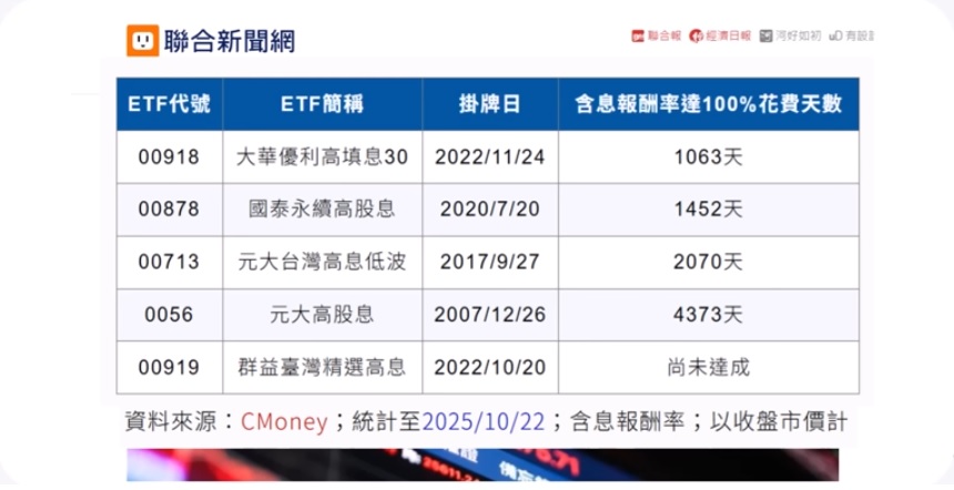 自2022年11月下旬掛牌以來,到2025年10月22日收盤,以市價計算,含息報酬率正式突破100%,代表投資人從00918上市第一天就投入了資金,現在已經成功翻倍,一共花了1063天,是0056的四分之一,而00919到現在都還沒有達標。