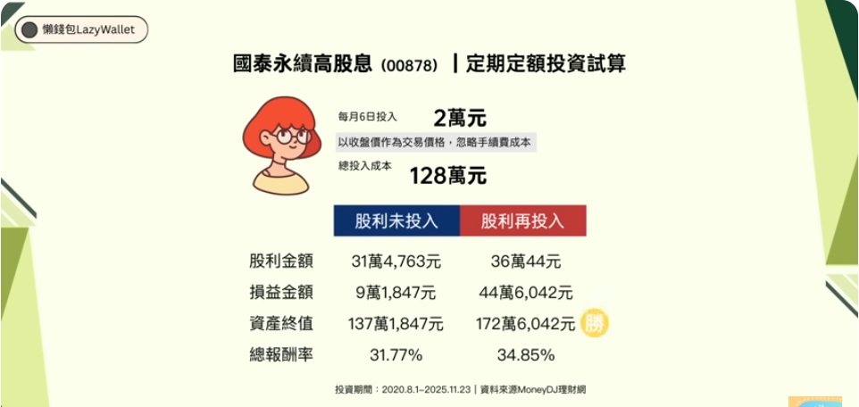 00878於2020年7月20號上市,我們從隔月開始定期定額,每月拿出2萬元投資,5年總投入金額128萬元。在股利未投入的情境下,最終資產會有137萬1,847元,報酬率31.77%。
