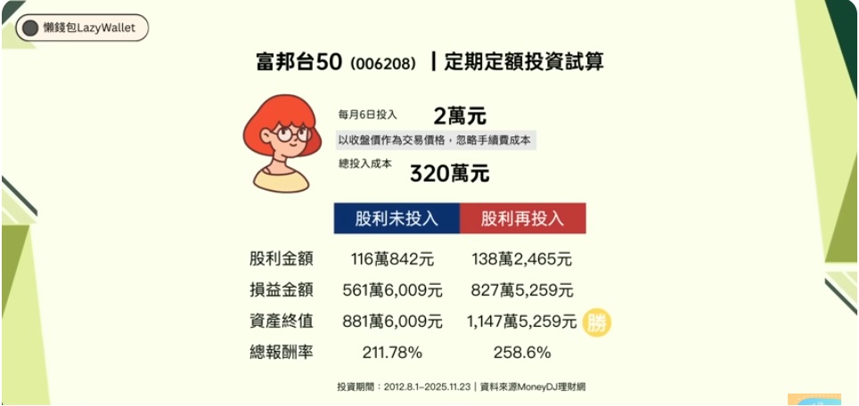那如果投資的是沒那麼主打配息、殖利率比較低的市值型ETF,股利有沒有再投入,差別會很大嗎?以2012年7月17號掛牌的006208為例,同樣隔月開始定期定額2萬元,走過了13個春、夏、秋、冬,總投入資金320萬元,這時如果選擇把配發的現金股利留下來(未再投入),最終資產會是881萬6,009元,報酬率211.78%。