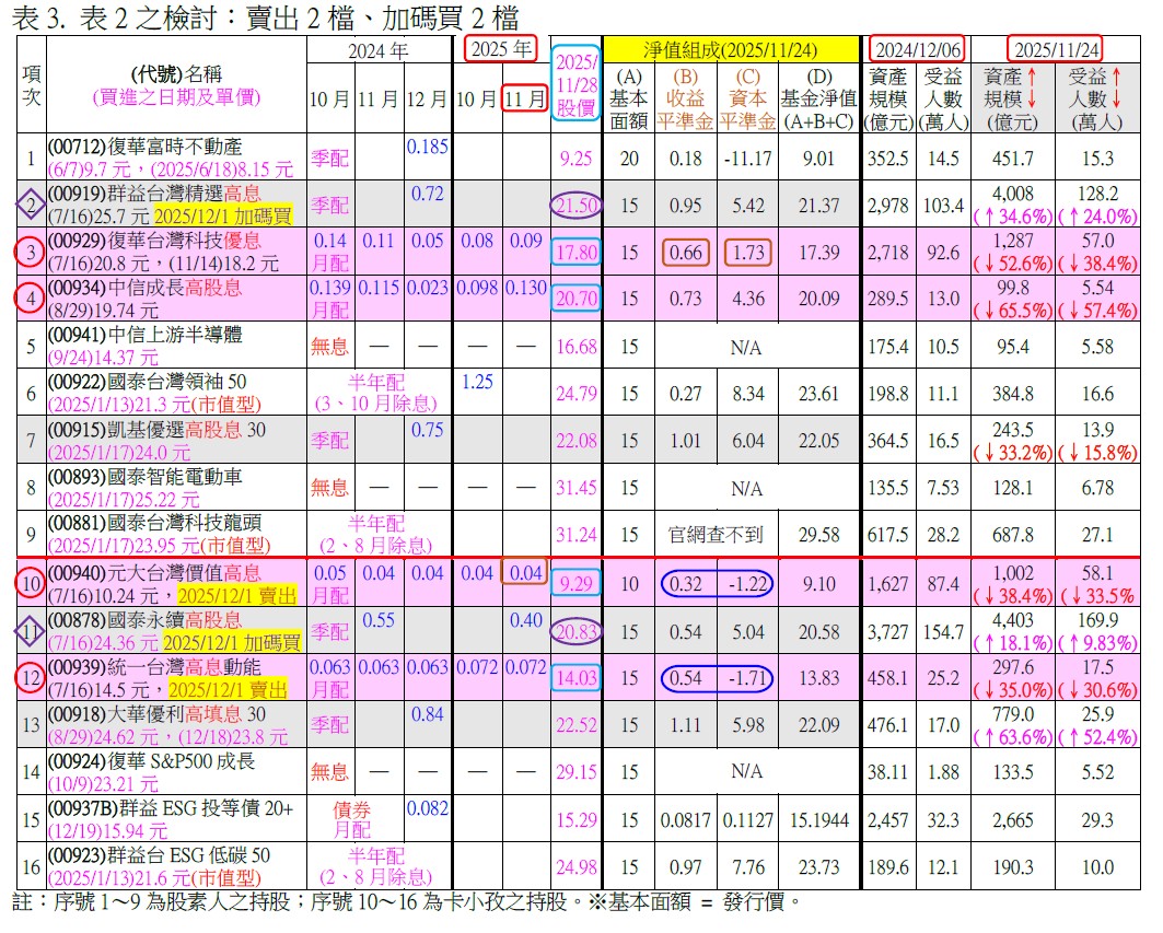 在考量買進成本及總持股數的配息率後,我們在2025/12/1修正表2的持股數量;如表3所示,賣出項次00940及00939的2檔資本平準金為負值且年配息率小於5%的月配高息型ETF,用來加碼買進股價跌12%以上的季配高息型ETF 00919及00878。