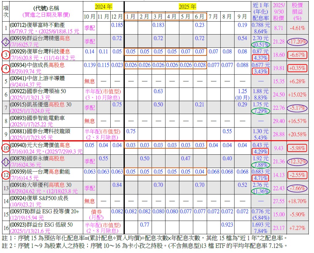 如今1年過去了,如表2的16檔ETF,其中00929、00934、00940及00939,這4檔月配息高息型ETF之配息率均低於5%,表現「名不符實」。