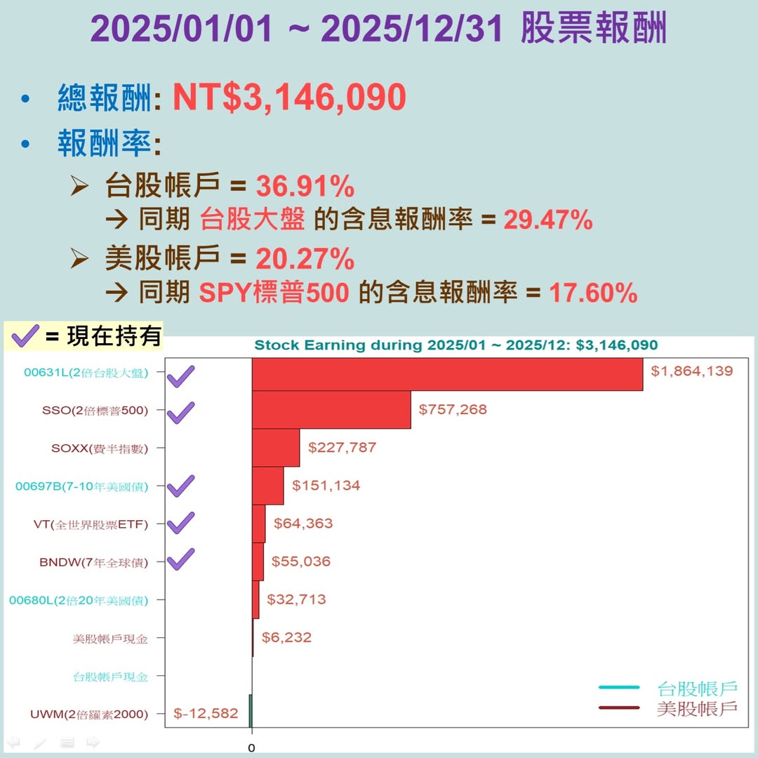 | 台股帳戶 | 00631L (2倍台股大盤) | 490萬964元 | 35.33% | 200% | 980萬1,928元 |