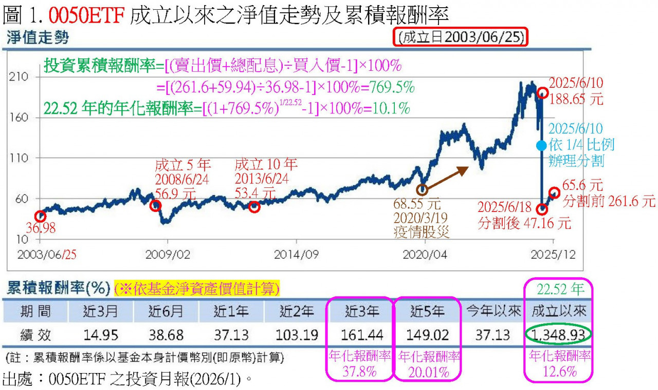 0050(元大台灣50)是市值型ETF的代表,圖1是0050的淨值走勢與累積報酬率,自其成立以來的累積報酬率為1,348.93%(22.52年),似乎很高,讓未持有0050的人「悔不當初」、「早知就歐印0050」…