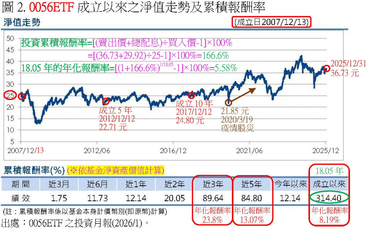 而0056的累積報酬率314.4%,換算成年化報酬率8.19%,遠低於台股的加權股價報酬指數之年化報酬率13.05%,故算是投資績效「中下等」的ETF。