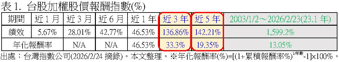 台股的加權股價報酬指數常被作為投資績效的比較基準,如表1所示,台股市場自2003/1/2的紀錄以來,2003/1/2~2026/2/23(23.1年)的加權股價報酬指數為1,599.2%,相當於年化報酬率13.05%。