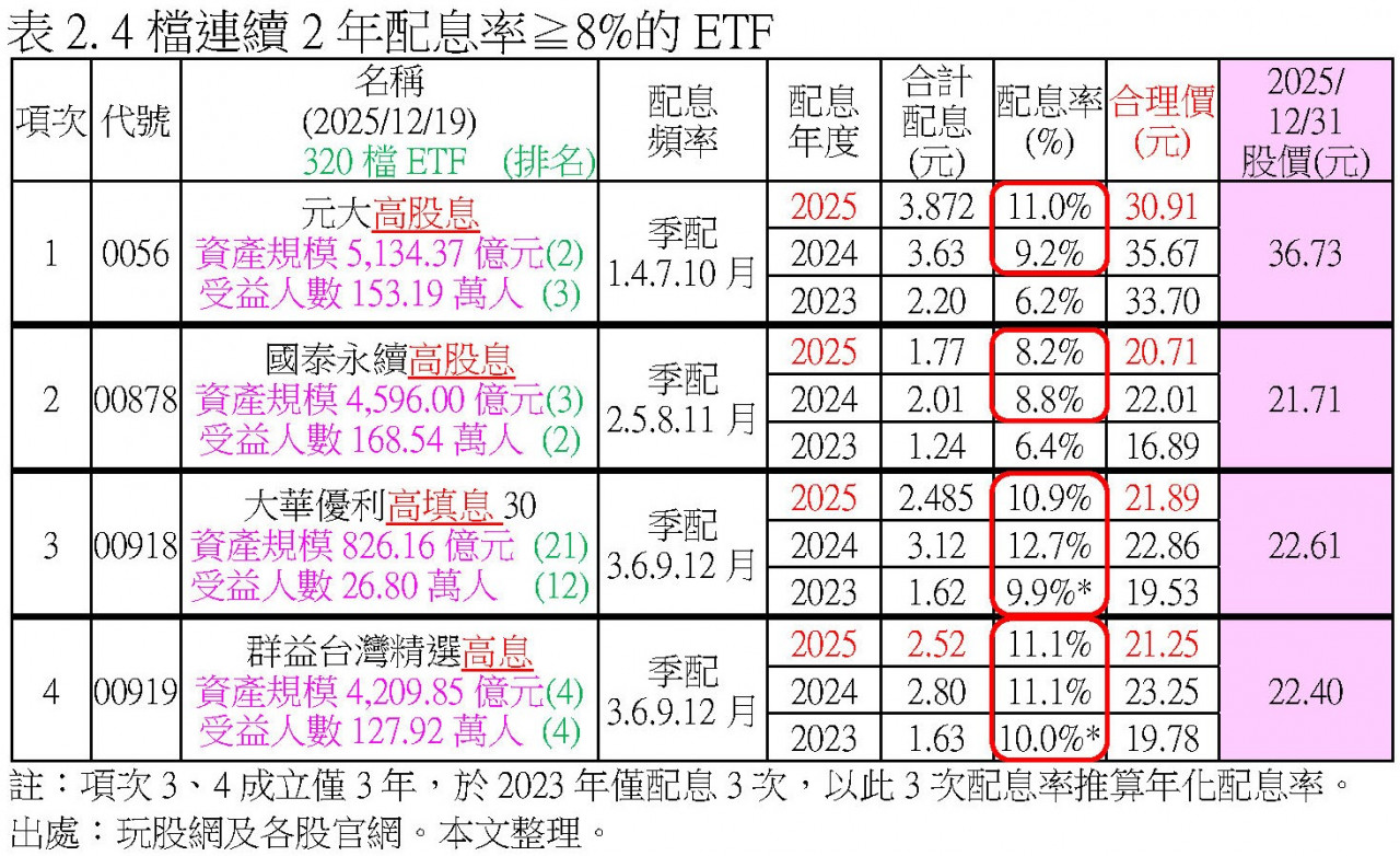 小資族多偏愛高息型ETF,然而,高息型ETF多「名不符實」,台股總計33檔高息型ETF中,能夠連續2年配息率≧8%的僅有4檔,分別如表2的0056、00878、00918及00919,此4檔均為季配息的ETF。