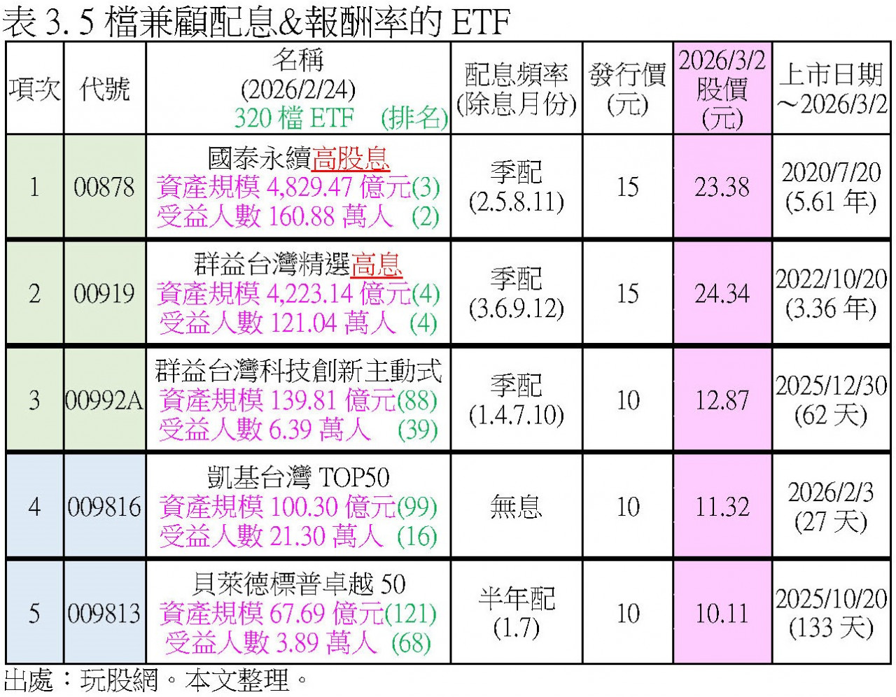 表3之項次00992A、009813、009816均是成立未滿半年的ETF,但其受益人數排名(39、16、68),已擠進前20%(台股約有320檔ETF),其股價仍低,加上表4的10大成分股與5大產業別,故未來的配息率及累積報酬率應可不亞於0050及0056。