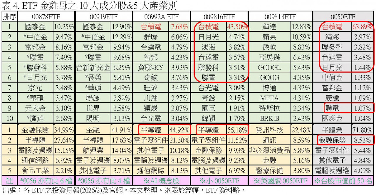 投資選股宜有所本,表3的5檔ETF除了考慮資產規模與受益人數之外,也參考表4的前10大成分股%5大產業別,因為00878、00919及009816ETF的內涵,與0050、0056有多處重疊,而0050及0056的股價偏高,故放棄熱門的0050及0056。