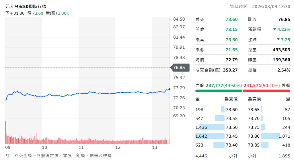 不過,這波劇烈震盪似乎激起了投資人的「抄底魂」,0050 在周一終場收在 73.60元,跌幅收斂至 4.23%,全天更爆出超過 49 萬張的驚人成交量,刷新了 3 月 4 日 45 萬張的歷史紀錄,顯見許多投資人正趁亂加碼。