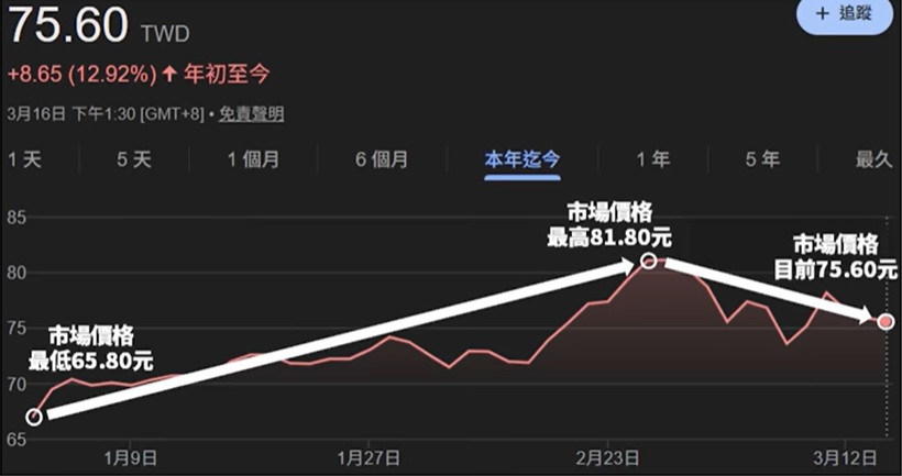 今年1月到2月,市場原本一片樂觀,新年第一天的價格,甚至就是0050今年的最低價。0050(元大台灣50)一路從65.8元漲到81.8元,但到了3月戰爭爆發後,市場情緒突然反轉。石油價格飆升,市場預期通膨將持續惡化,0050價格也一路下跌到影片當下的75.6元(編按:3/23收盤價已跌至74.25元)。