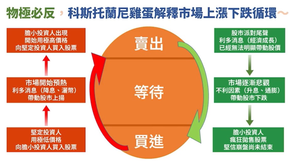 傳奇投資人科斯托蘭尼曾用「雞蛋」來比喻市場情緒:當你身邊最保守的人,不管價格多低都想停損賣出,代表市場情緒已經接近低點。當他不管價格多高都堅持買進,代表市場情緒已經過熱。如果你能掌握這種情緒循環,就有機會在低點買進、高點賣出。