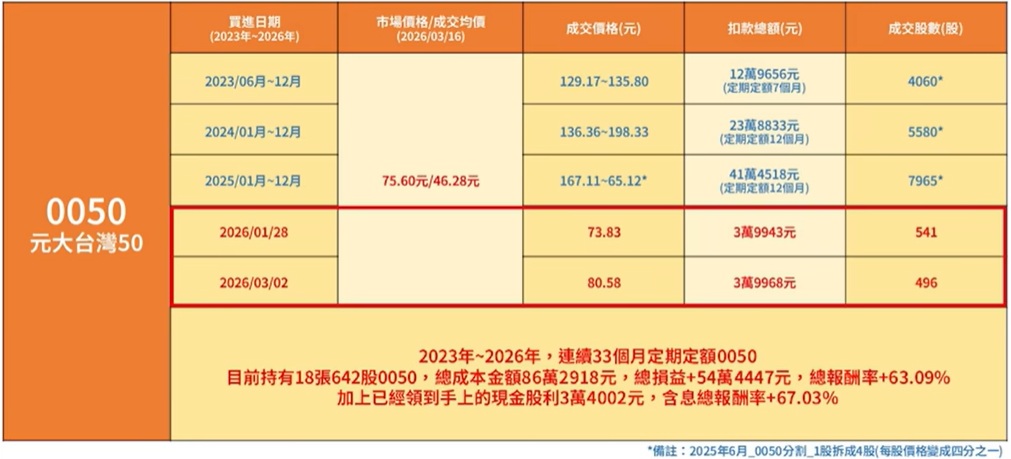 到2026年為止,已經連續33個月定期定額。實際績效公開:3年報酬率67%。目前知美持有0050共18張又642股: