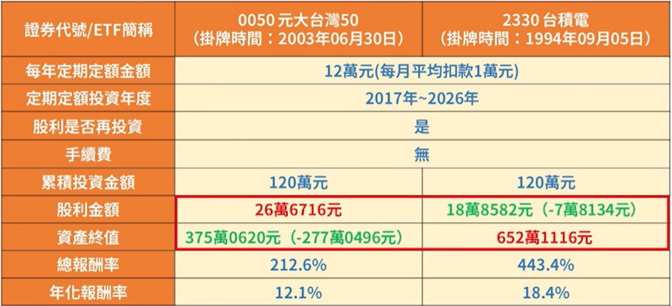 雖然0050能領到較多現金股利,但從結果來看,台積電的報酬更高。