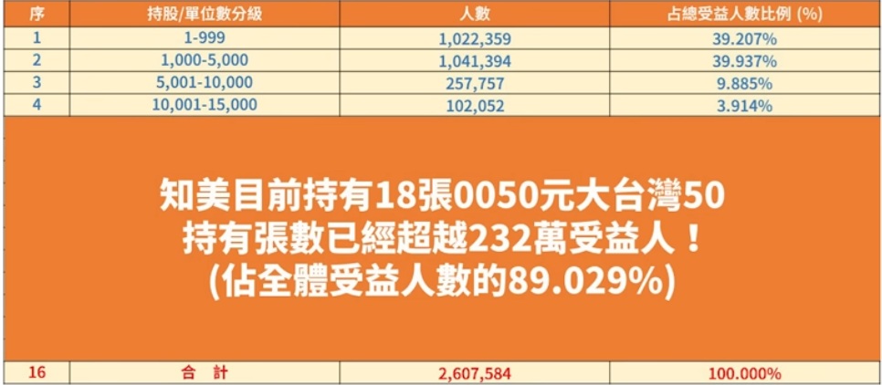 0050目前的受益人數,已經來到260萬7584人,知美目前持有18張0050,已經超越232萬的受益人(近90%的受益人數),印證一句話,你不用很厲害才可以開始,但一定要開始才會變厲害。
