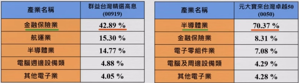 00919 與 0050 不只追蹤指數不同,選股邏輯不同,連產業配置也有明顯差異。從成分股來看,這兩檔ETF最主要的產業類別,分別是: