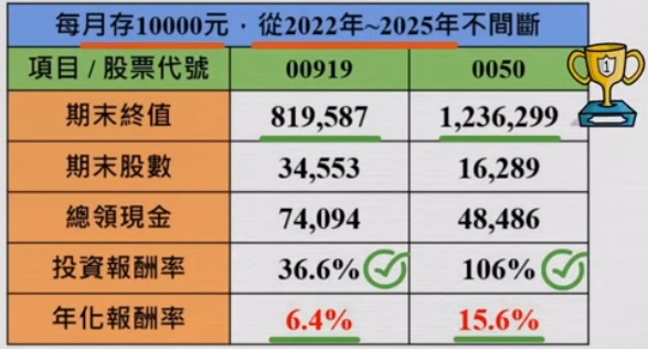 從這組數據可以很清楚看出來,0050 的投資報酬率明顯高於 00919。