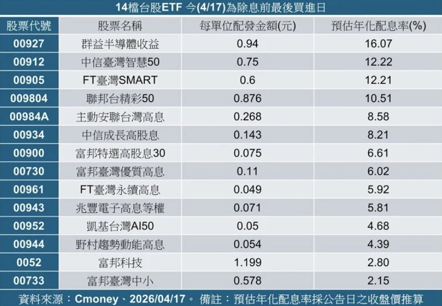 14 檔台股 ETF 4/17為除息前最後買進日
