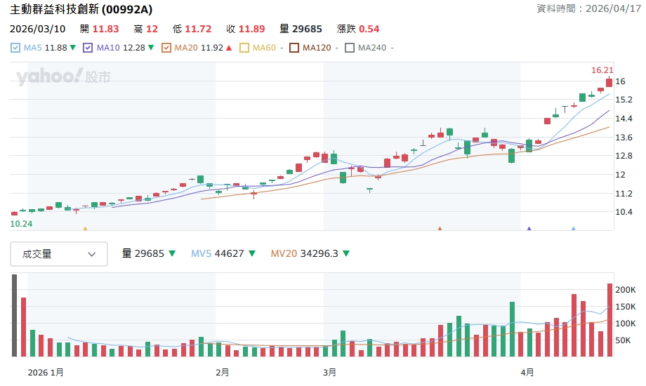 另外,統計至4月15日,今年來日均量萬張以上、價量齊揚的主動式台股ETF共有10檔,以科技為投資主題的主動群益科技創新(00992A) 今年來上漲46.88%漲幅居冠,其次是主動統一台股增長(00981A),而包括主動群益台灣強棒(00982A)、主動中信台灣卓越(00995A)、主動野村臺灣優選(00980A)、主動復華未來50(00991A)也都有3成以上漲幅的好表現。