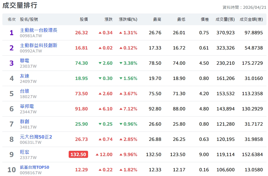 00992A週二(4/21)同樣氣勢如虹,終場上漲0.08元,以16.87元作收,成交量來到41萬7058張,僅次於另一檔主動式ETF 00981A,躍居台股個股成交量第2名。