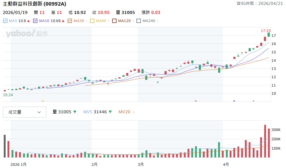 | 00992A | 主動群益科技創新 | 16.79 | 4.48 | 60.98 |