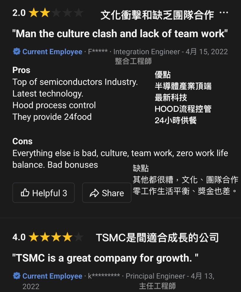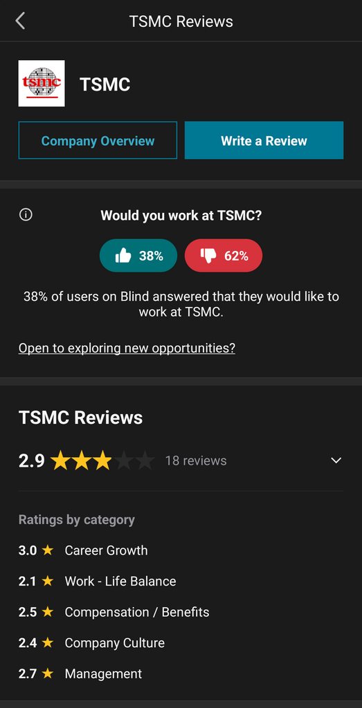 有網友在美國科技業匿名論壇Blind發現,台積電評分僅2.9顆星(滿分為5顆星),外國人評論都聚焦在台積電上班嚴重失衡,生活品質也不能夠兼顧到。