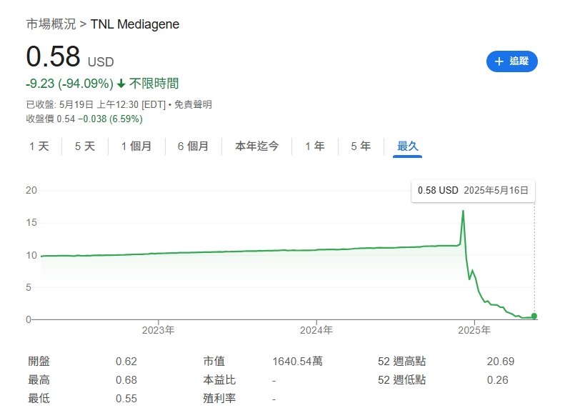 亞洲次世代數位科技媒體集團TNL Mediagene(TNMG)在去年12月6日風光掛牌納斯達克,股價最高來到17美元,但從線圖來看卻似乎僅是一日行情,交易6天即跌破10美元大關,截至上周五(5/16)股價只剩0.58美元,崩跌超過96%。