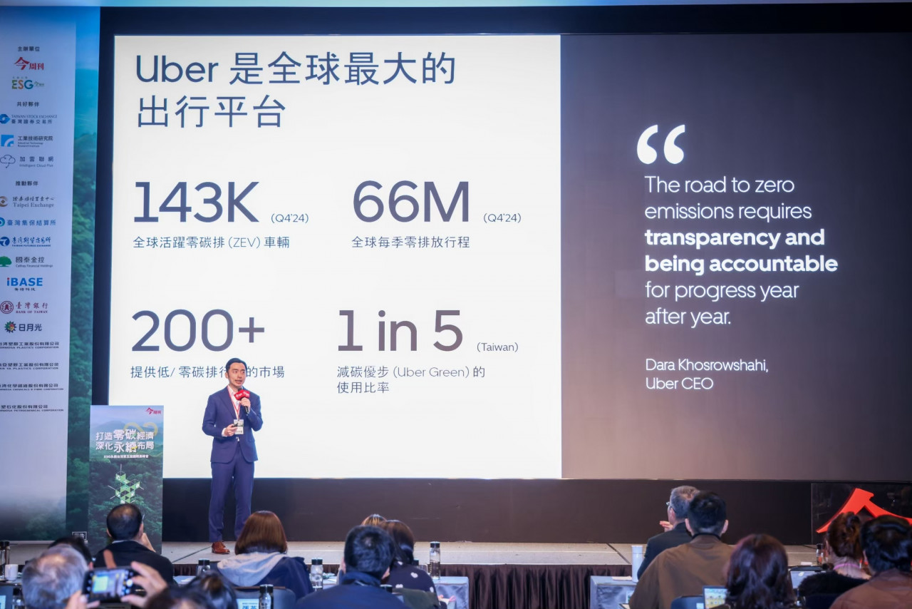 ▲Uber for Business北亞區總經理林梓聖分享 Uber 在全球及台灣的永續轉型計劃與目標。