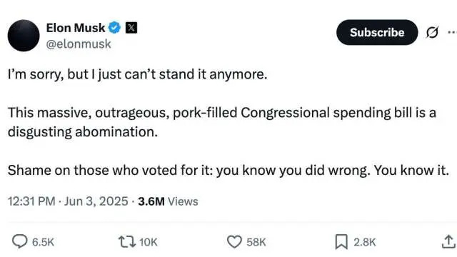 馬斯克補充說:「這個龐大、離譜、充滿豬肉桶條款的國會支出法案是個令人作嘔的畸形產物。那些投票支持的人應該感到羞恥:你們知道自己做錯了,你們心知肚明。」