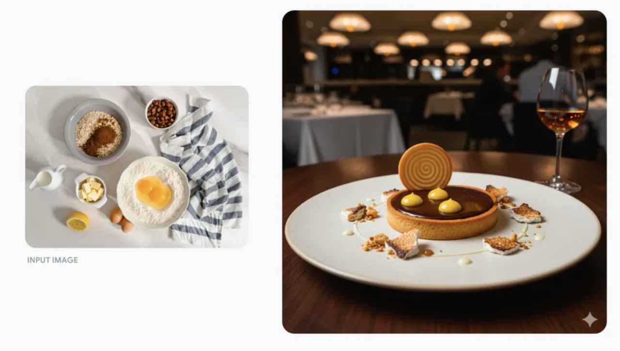 提示:將這些食材轉化為精緻美味的甜點,靈感來自這些食材。擺盤方式如同五星級前衛餐廳的料理。(Prompt: Turn these ingredients into a refined delicious-looking dessert, inspired by these ingredients. Plate it as if it were a dish at a 5-star avant-garde restaurant.)