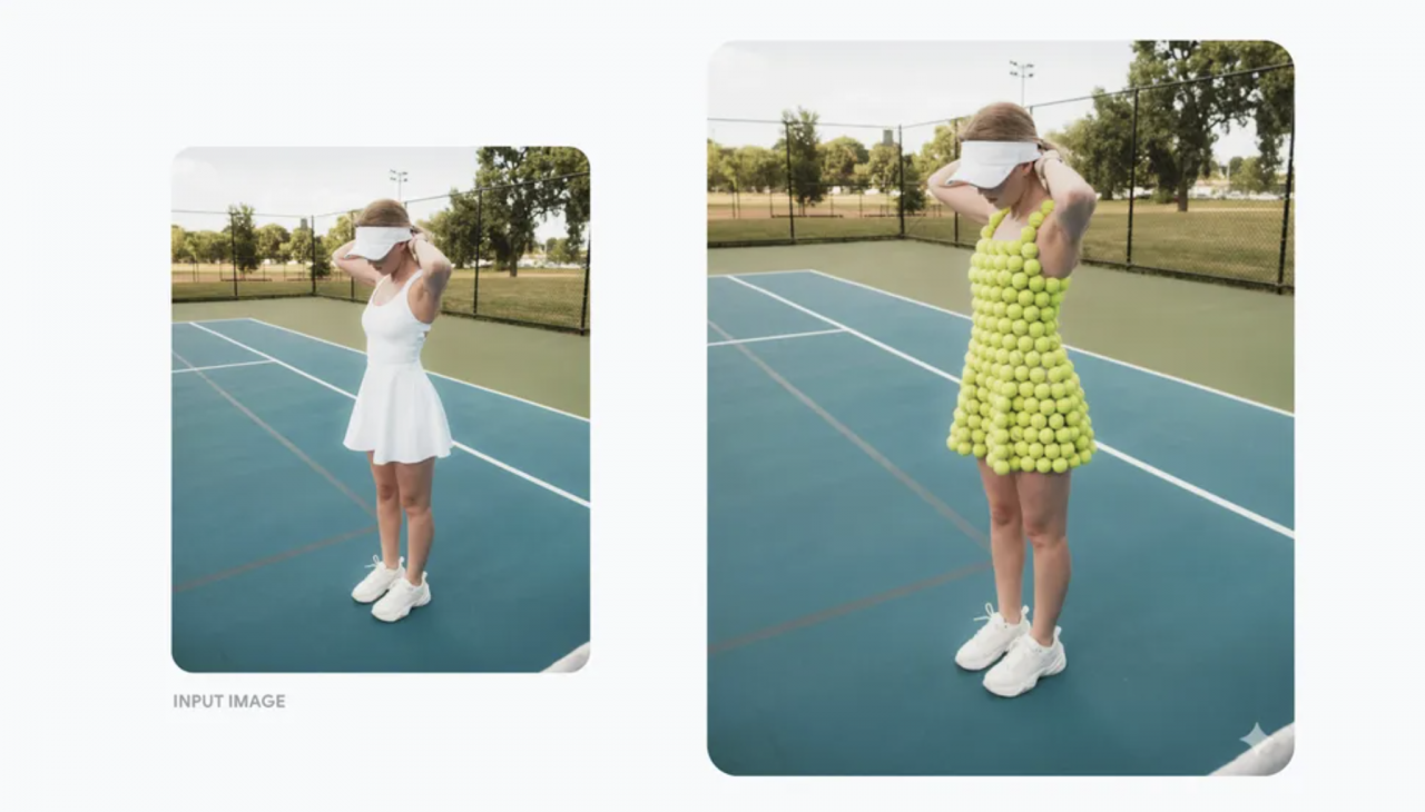 提示:把這個人的衣服改成網球做成的。(Prompt: Change this person's dress to be made out of tennis balls.)