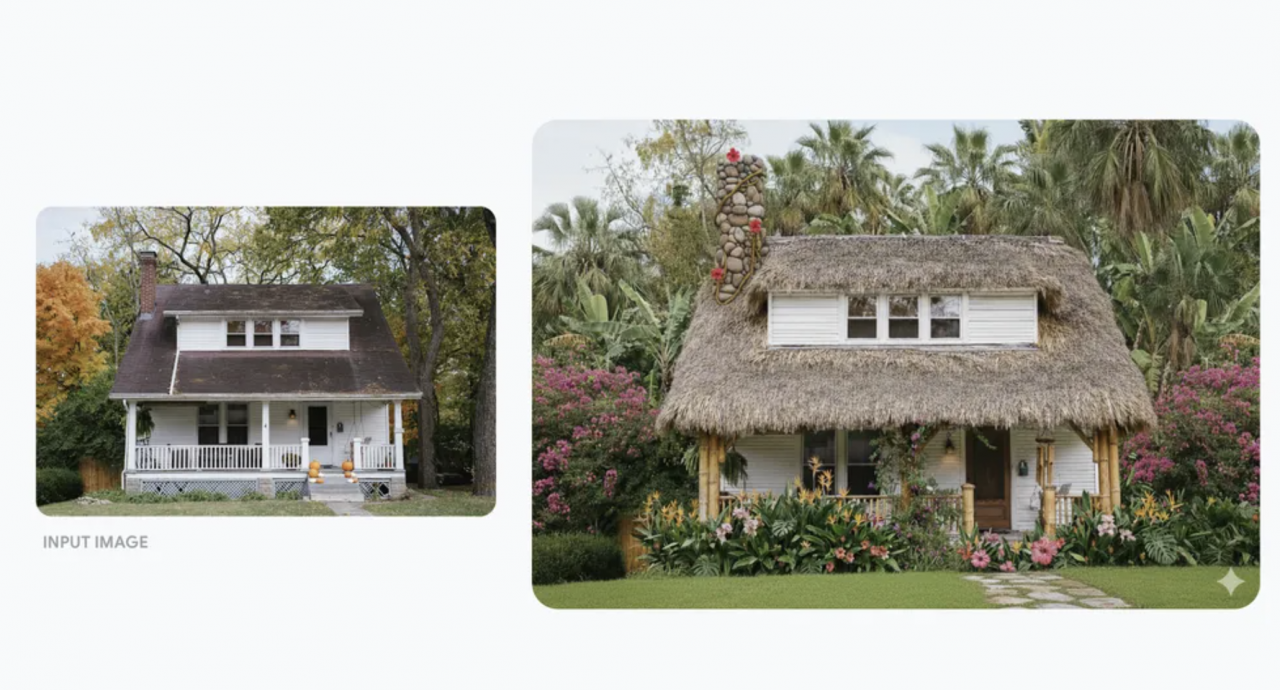 提示:將這棟房子改造成充滿活力的熱帶島嶼風格。用茅草屋頂代替,並添加竹子結構元素。周圍環繞著鬱鬱蔥蔥、色彩繽紛的熱帶植物和棕櫚樹。(Prompt: Transform this house into a vibrant tropical island design. Replace the roof with thatch and add bamboo structural elements. Surround it with lush, colorful tropical plants and palm trees.)