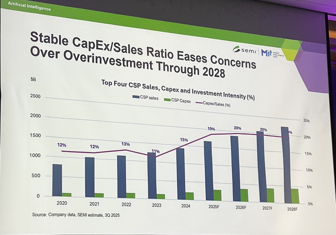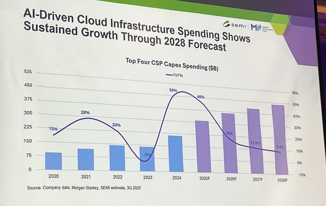 「我們半導體產業的資本支出,大概是1500~2000億美元,已經相當高了,但光是四大CSP的投資在infrastructure(基礎建設)的部分,就比半導體業整個資本支出多出一倍,這樣背景下的投資會帶動很多AI相關半導體的支出。」