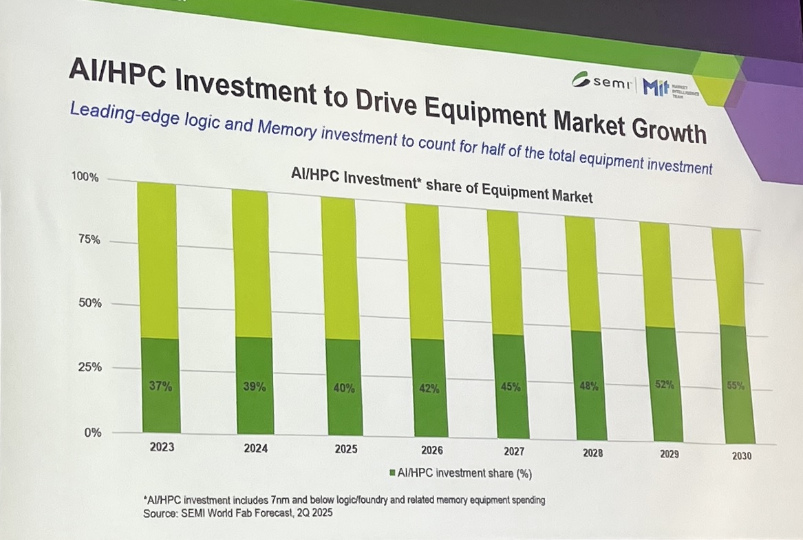 曾瑞榆指出,跟AI跟HPC(高速運算)相關的半導體設備投資,在全球半導體設備市場的比重,若以7奈米製程以下的邏輯晶片及相關記憶體來看,2025年大約佔40%資本支出,預計到2027年會拉到45%,2030年進一步提升至55%。