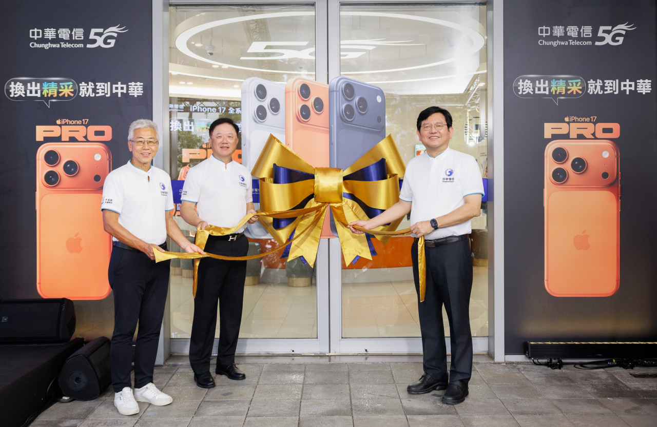 中華電信開賣iPhone 17全系列新機,董事長簡志誠(左2)、總經理林榮賜(右)、個人家庭分公司總經理胡學海(左1)於台北東區服務中心首賣會現場迎接果粉。(攝影:中華電提供)