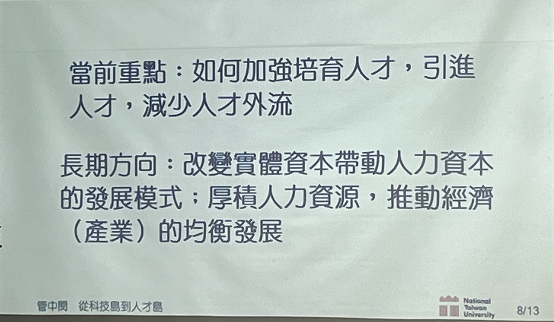 前國立台灣大學校長管中閔以「從科技島到人才島」為題,發表約20分鐘演講,他認為當前台灣高等教育的重點,在於加強培育人才、引進人才,並減少人才外流,特別是要改變以實體資本帶動人力資本的發展方式。