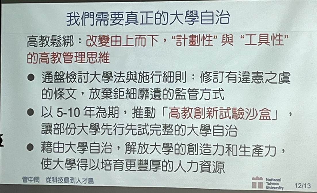 管中閔:台大嚴格來說只是教育部公館分校!台灣要真正做到大學自治,建議「以5~10年做高教沙盒試驗」