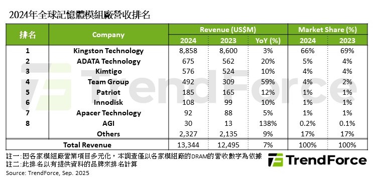 根據產業研究機構TrendForce統計,威剛科技是全球第二大記憶體模組廠,僅次於美國的京士頓(Kingston),2024全年營收成長兩成至6.75億美元,惟與京士頓同期的88.58億美元仍是小巫見大巫。