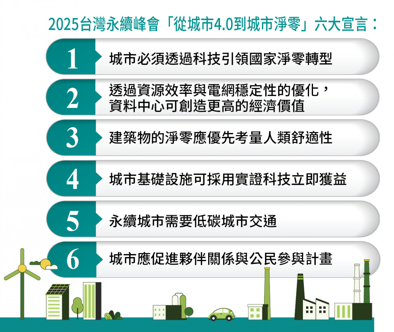 2025台灣永續峰會與會講者一致認同,城市是全球消耗能源和排放溫室氣體的主要來源,城市應站在淨零最前線,運用科技槓桿「以少達多」,節「源」減碳,引領國家淨零轉型。