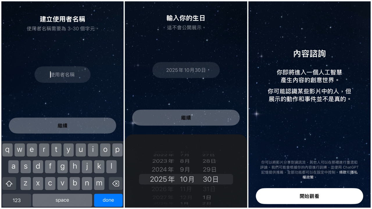 第三步:建立使用者名稱、輸入生日後,點擊開始觀看。開始使用前,Sora也提醒,即將進入一個人工智慧產生內容的創意世界,使用者可能認識某些影片中的人,但展示的動作和事件並不是真的,再次強調了Sora所有內容都是AI生成的。