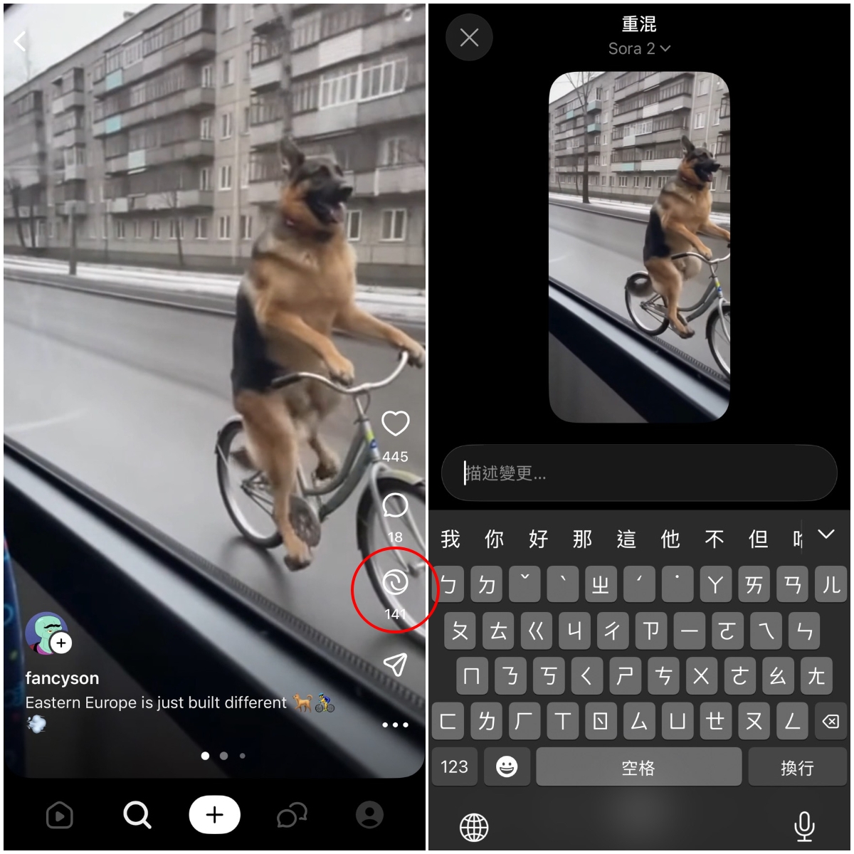 在 Sora App 中生成的內容,其著作權皆屬創作者所有。因此,每支 remix 作品都會清楚標示原始來源,並提供左右滑動功能,讓使用者在觀賞影片時能一覽從原始片段到最終版本的創意演變軌跡。