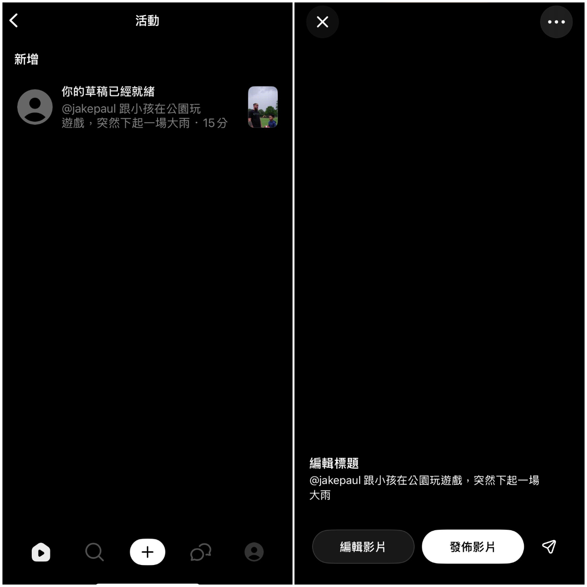 步驟2:點擊右下角個人動態,便可以在貼文區看到草稿,最後按下發佈影片,即可公開給大家瀏覽,還可以將影片儲存至相簿,或是分享到其他社群。