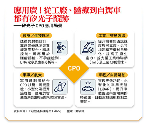 除了AI資料中心,矽光子CPO還有其他應用場景,包括工業領域的智慧製造、車載的自動駕駛、醫療領域的生技感測、軍事與航太等四大領域可望接棒;不論是吃牛肉還是喝湯,後續商機都不只一碗,而是一碗接著一碗。