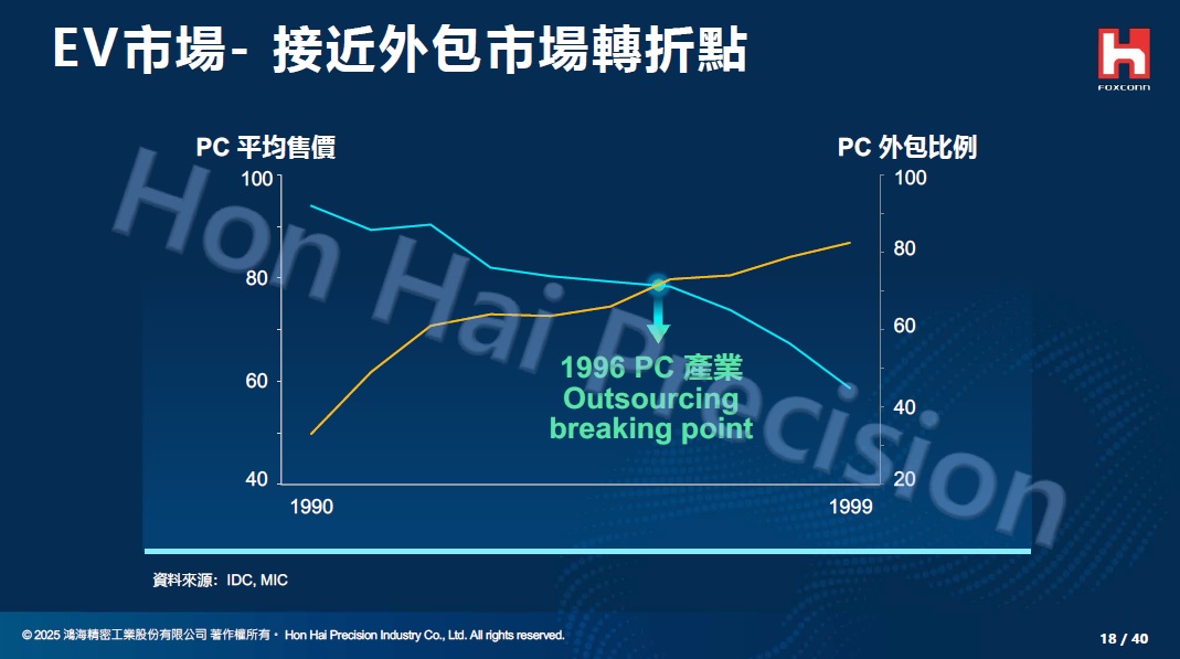 除了上述進度說明,劉揚偉在鴻海集團2026年展望中,少見的花了一點時間,引用了1990年代PC產業從全自製到全外包的歷程,說明他為何認為全球電動車外包代工的關鍵時刻即將到來。