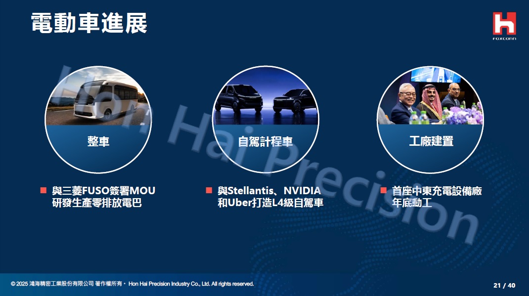 此外,集團旗下FIT跟沙烏地阿拉伯的合資公司,年底前將開始在中東興建電動車充電樁的生產基地,預計最快2026年投產。