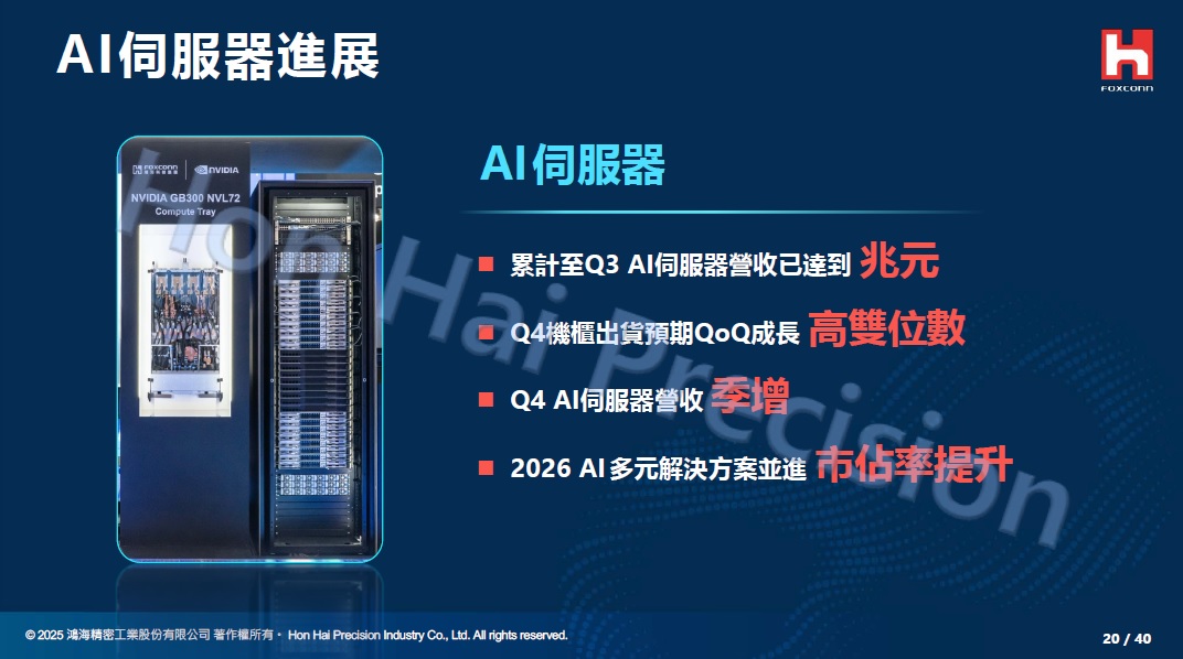 此外,鴻海也陸續推進主權AI業務,目前已參與美國、台灣、日本等重大主權AI的專案,預計2026年鴻海AI伺服器(生產)的市佔率目標將高於目前的四成。