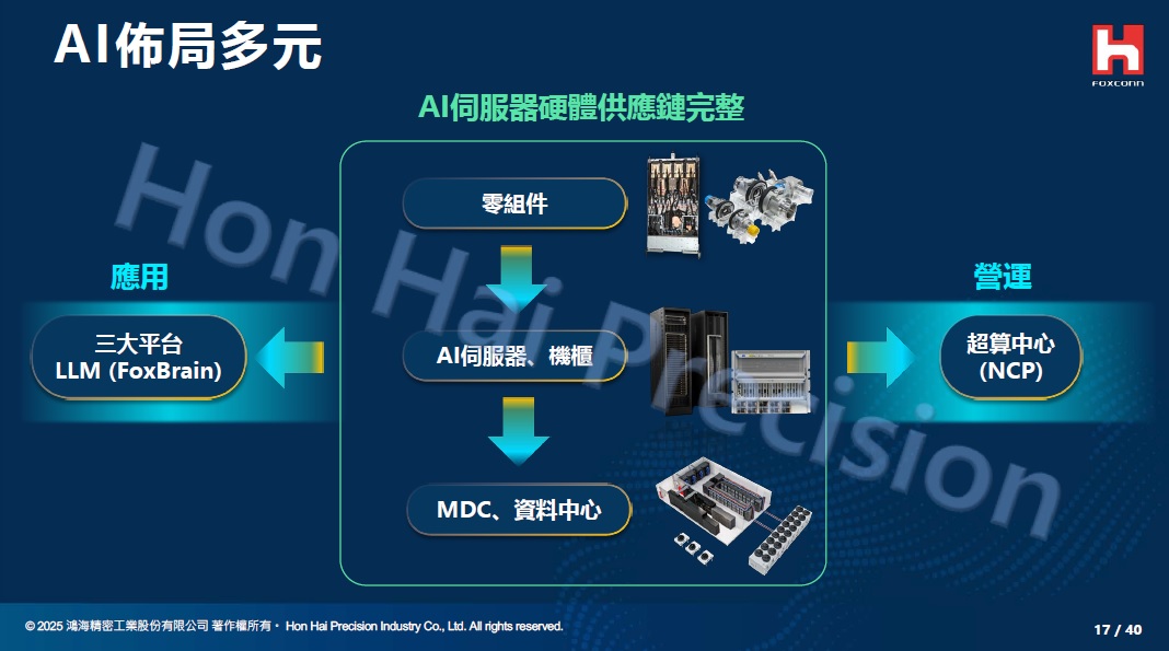 「我們也持續擴大在AI的版圖,除了硬體的上下游整合,也積極開發AI應用,和扮演AI資料中心營運的角色。今年初推出的FoxBrain AI大語言模型持續在改版,聚焦在三大智慧平台及自駕車的應用,希望最終成為繁體中文界最重要的大語言模型。」