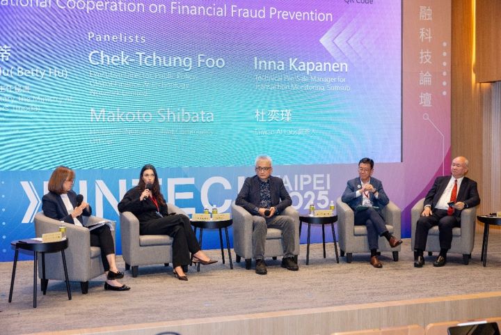 綜合座談「金融詐騙與國際聯防」由數位發展部主任秘書胡貝蒂、全球金融與技術網絡(GFTN)執行董事Chek-Tchung Foo、日本金融科技加速器FINOLAB負責人柴田誠(Makoto Shibata)、Sumsub 交易監控技術售前經理Inna Kapanen與台灣AI Labs創辦人杜奕瑾共同交流。