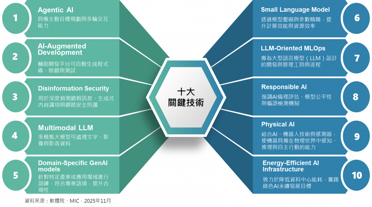 AI正成為全球軟體發展的核心主軸,從GenAI的興起,擴展至結合實體互動的Physical AI,持續全面滲透至百工百業。就技術而言,LLM朝向長文化、領域化、多模多工、平台化、小型化及代理人化發展;在應用面,AI加速企業流程自動化、商用AI Agent逐步落地、企業加速AI轉型。資策會發布2026年十大關鍵技術,包括實體AI(Physical AI)、特定領域生成式AI模型(Domain-Specific GenAI)、負責任AI(Responsible AI)等。這十大技術將重塑產業結構,帶動醫療健康、能源效率、人機協作等新應用。