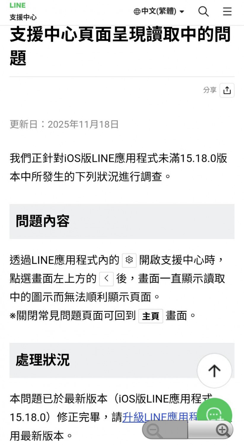LINE於周二(11/18)在支援中心回覆,關於iOS版LINE問題已於最新版本(iOS版LINE應用程式 15.18.0)修正完畢,請用戶升級LINE應用程式,並使用最新版本。