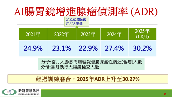 透過AI輔助影像分析,醫師能即時獲得畫面提示,提升檢查完整性與穩定性。根據昕新智慧診所內部統計,AI系統導入後,腺瘤偵測率有提升趨勢,反映出臨床應用與品質管理的持續進步。
